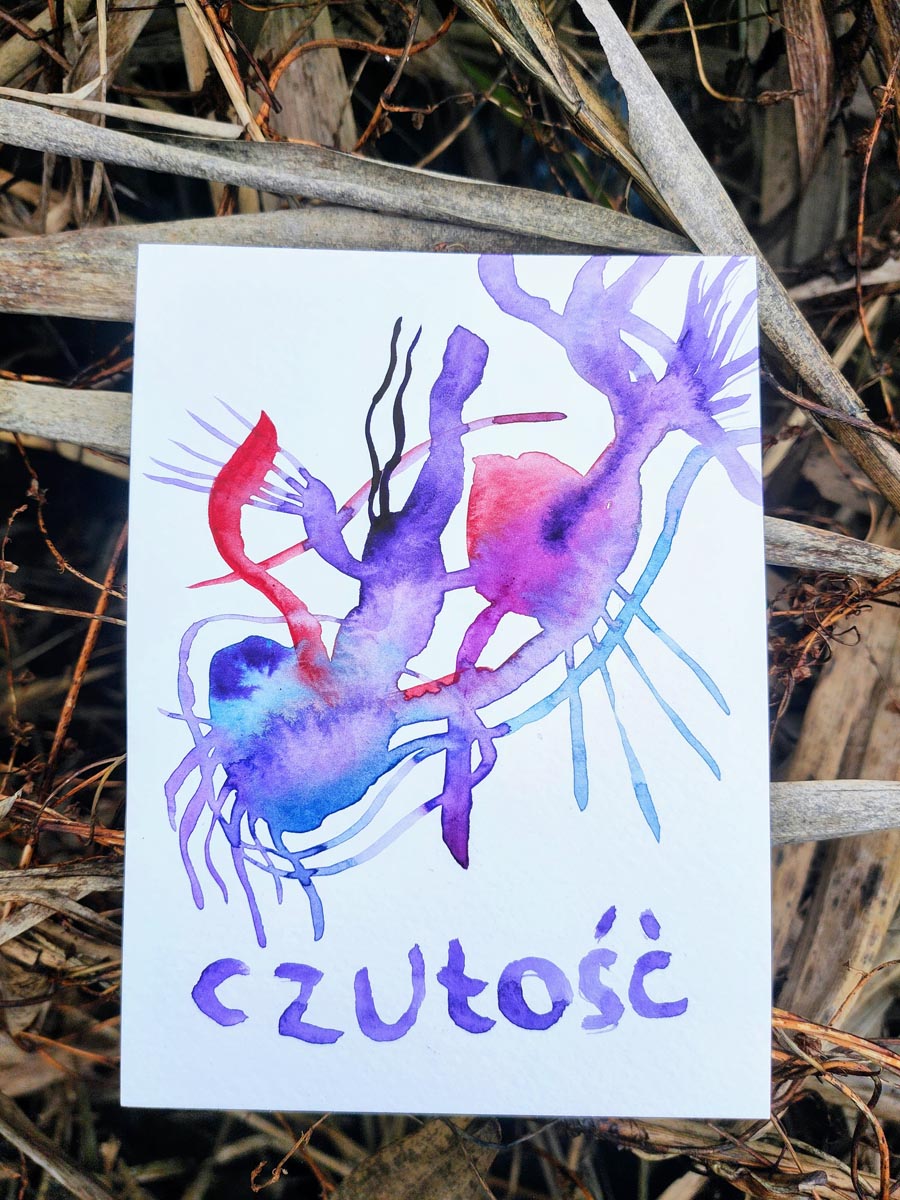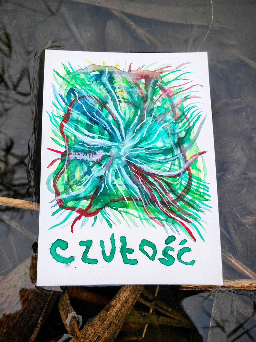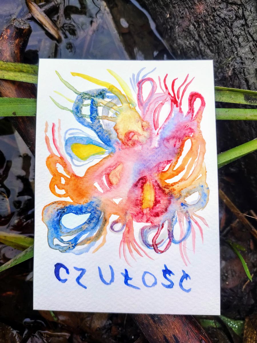 Seria ilustracji Czułość powstaje w technice akwarelowej. Pomysł narodził się spontanicznie i rozwija się już od jakiegoś czasu. Początkowo Czułość rozklejałam w przestrzeni miejskiej (Białystok, Częstochowa, Poznań). Małe Czułości zostawiam też w kawiarniach. Czułość to emocje przelane na papier. Akwarele sprawdzają się tu idealnie, nie do końca kontrolowany proces malarski, mieszanie się barw. Czułość rozpoczęła się z potrzeby – poszukiwań środku wyrazu, czegoś prostego, kameralnego. Lubię gdy ktoś wybiera sobie czułość – zwraca uwagę na kolory, kształty, skojarzenia. Czułości powstało już dużo, czułością obdarowuję, wypełniam nią przestrzeń. To taka gra słów, ale nie tylko, bo czułości potrzebuje każdy.