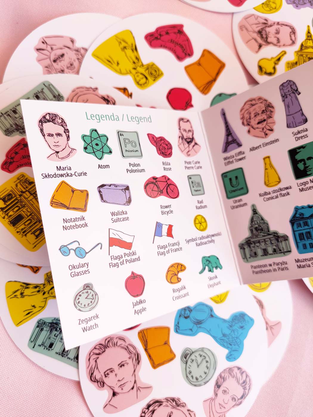 Na 57 kartach znajdują się obrazki prezentujące osoby i rzeczy związane z Marią Skłodowską-Curie, Nagrodą Nobla, nauką i Warszawą.